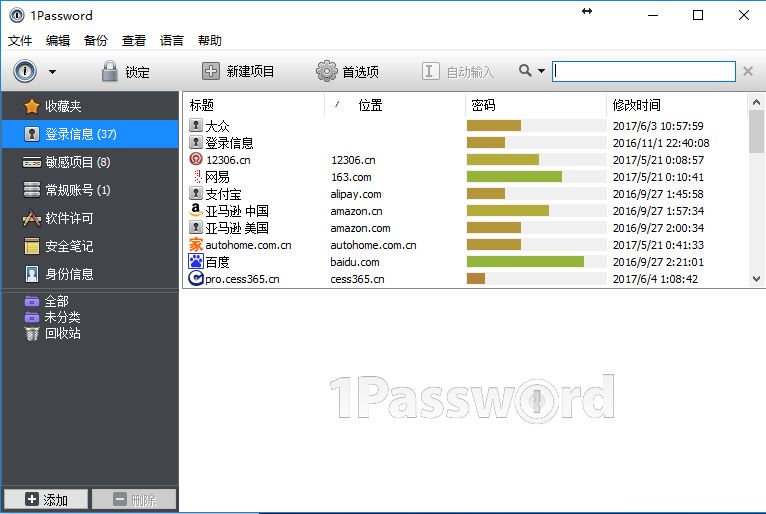 1Password 是一款优秀的跨平台的密码管理工具,支持 Windows、Mac、iOS、Android 等主流操作系统,Mac /安卓 版本已经支持中文,作为口碑极佳且上镜率最高的密码管理器,使用过的人都对其赞赏有加,不过由于它价格较高,所以并不太广为人所知。